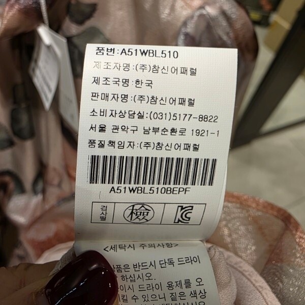 | 9. A/S 책임자와 전화번호 | AS 및 기타 문의 사항은 해당 매장 [오은숙,053-253-2520] 으로 전화주시면 감사하겠습니다. AS 및 기타 문의 사항은 해당 매장 [오은숙,053-253-2520] 으로 전화주시면 감사하겠습니다. |