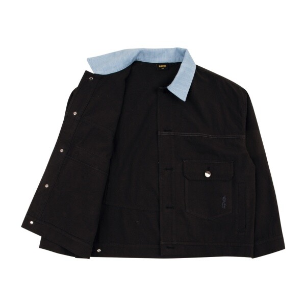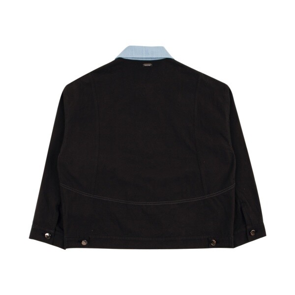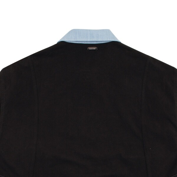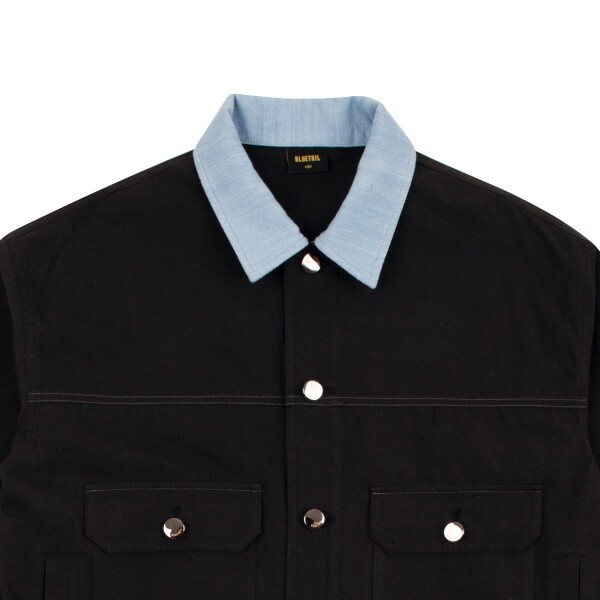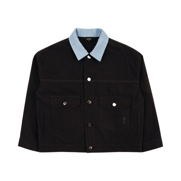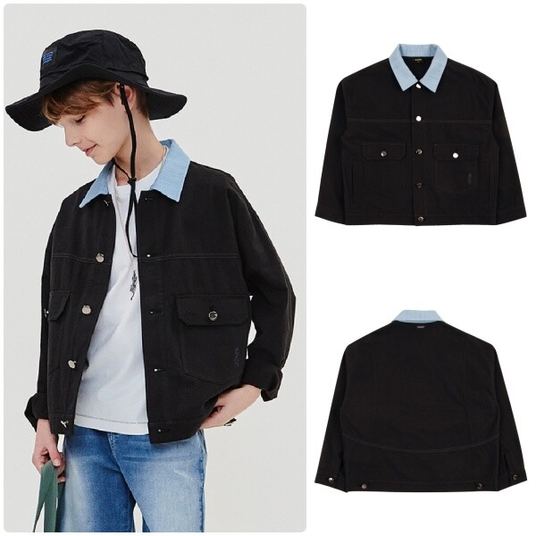 카라에 마치 리폼 한 듯 데님이 믹스된 블랙 트러커 자켓입니다. 크롭한 기장감과 여유로운 사이즈로 편하게 입을 수 있습니다. 4개의 주머니로 수납공간이 충분하며 포켓에 블루테일 도마뱀 자수가 포인트가 되는 아이템 입니다.