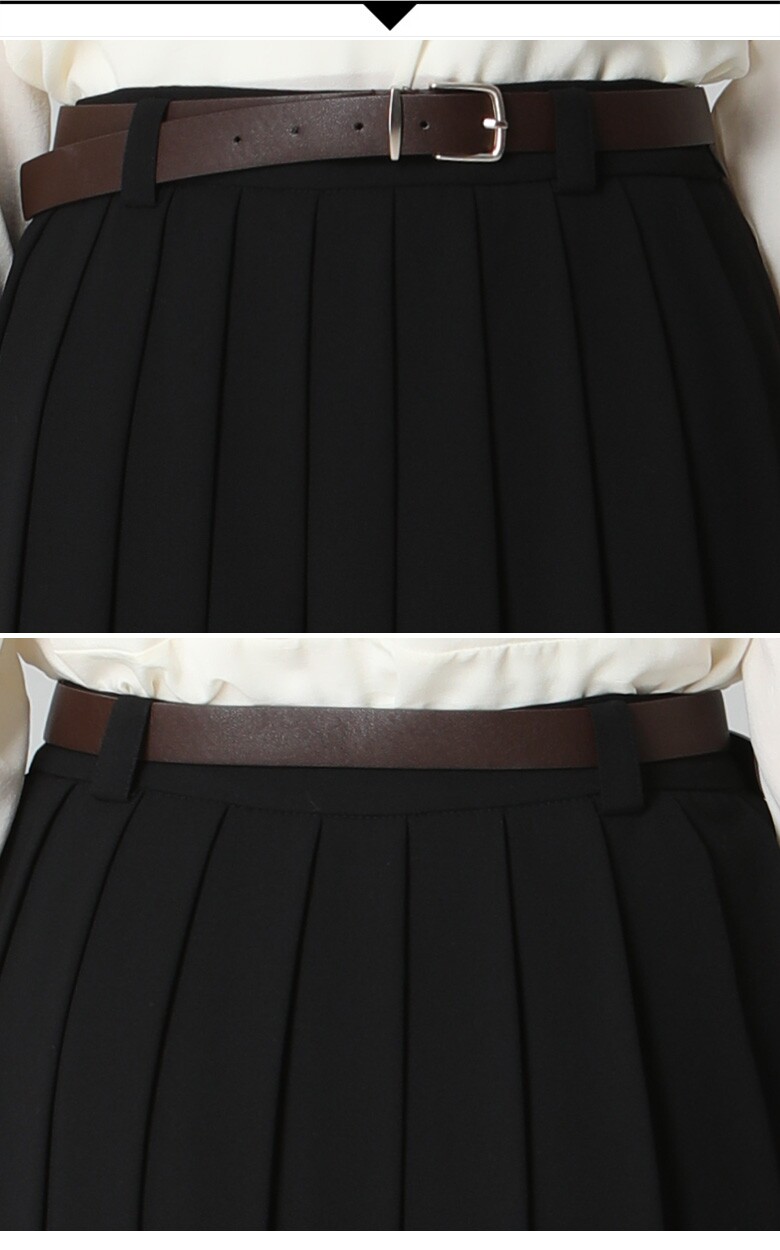 플리츠 주름의 스커트로 사이드 지퍼 여밈이 있으며 안쪽 안감과 가죽 벨트가 있는 스커트입니다.