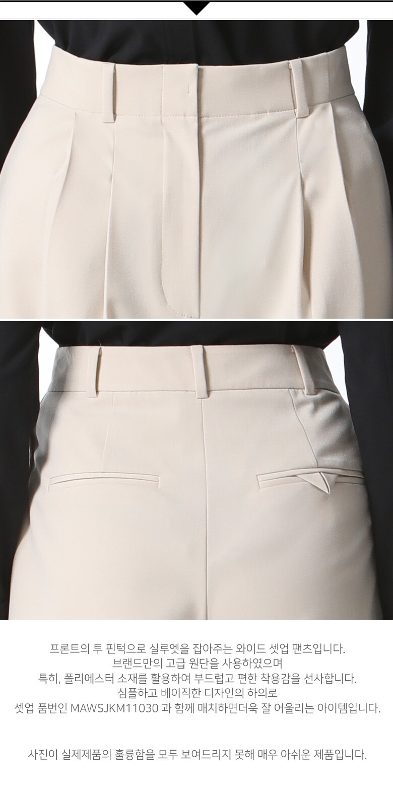 ▶ ITEM : 히든 버튼 투 핀턱 와이드 팬츠 ▶ NUMBER : MAWSSLM11030 ▶ FABRIC : [겉감] 폴리에스터 66%, 레이온 29%, 폴리우레탄 5% ▶ WASHING : 전문손세탁 ▶ 원 산 지 : 베 트 남 ▶ 색 상 : 라이트베이지(LB),다크네이비(DN)