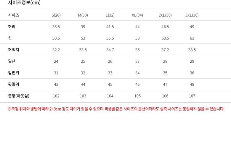 | 3. 치수 | S(28),M(30),L(32),XL(34),2XL(36),3XL(38) |