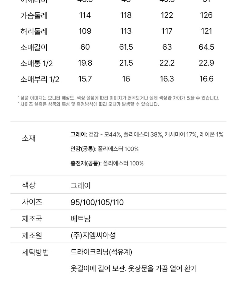 | 1. 제품 소재 (섬유의 조성 또는 혼용률을 백분율로 표시, 기능성인 경우 성적서 또는 허가서) | 상세페이지 참조 |