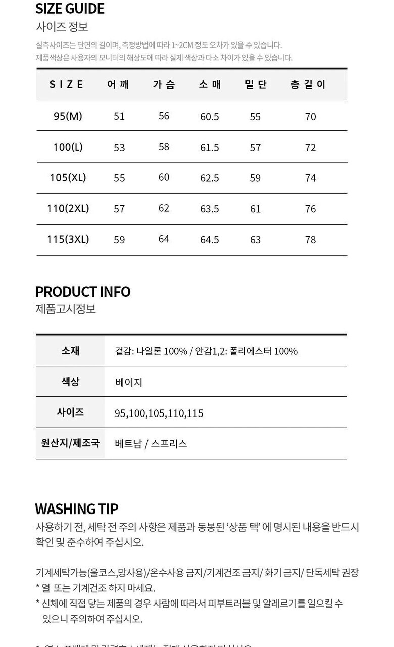 1. 제품 소재 (섬유의 조성 또는 혼용률을 백분율로 표시, 기능성인 경우 성적서 또는 허가서) | 겉감 : 나일론 100%, 안감1,2 : 폴리에스터 100% |