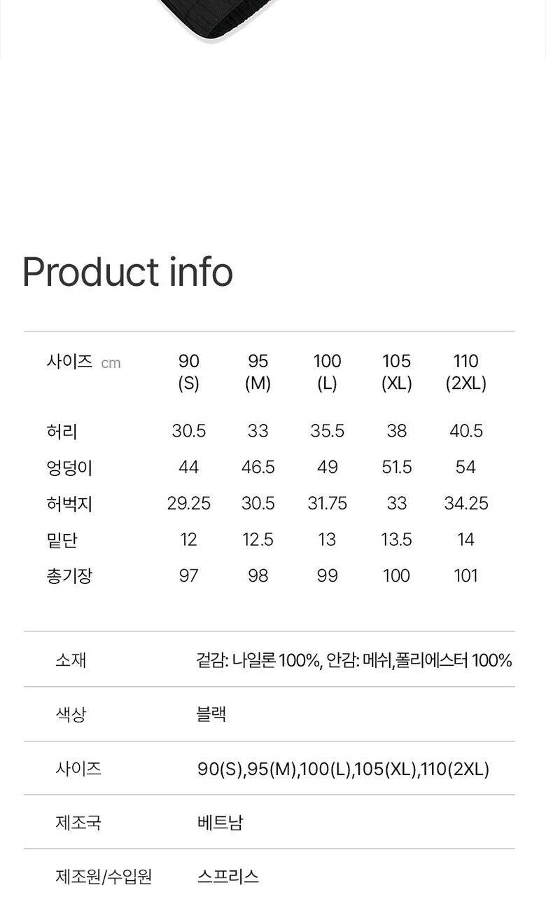 1. 제품 소재 (섬유의 조성 또는 혼용률을 백분율로 표시, 기능성인 경우 성적서 또는 허가서) | 겉감 : 나일론 100%, 안감 : 메쉬, 폴리에스터 100% |