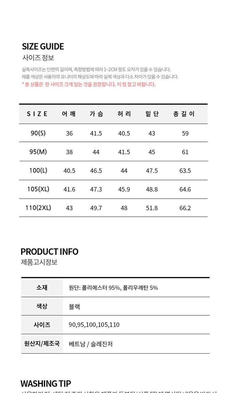 1. 제품 소재 (섬유의 조성 또는 혼용률을 백분율로 표시, 기능성인 경우 성적서 또는 허가서) | 겉감 : 폴리에스터 95%, 폴리우레탄 5% |