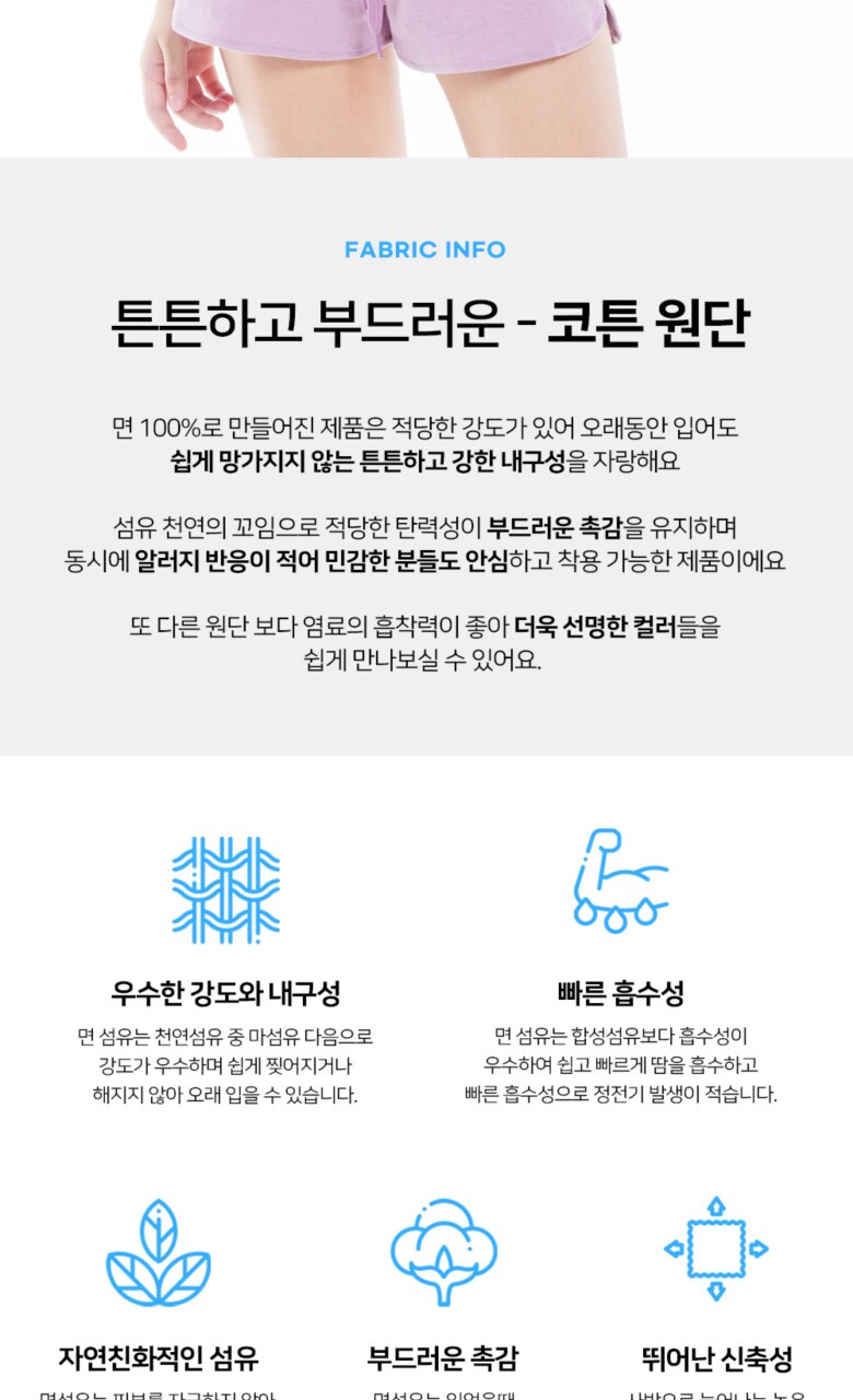 1. 제품 소재 (섬유의 조성 또는 혼용률을 백분율로 표시, 기능성인 경우 성적서 또는 허가서) | 면 100% |