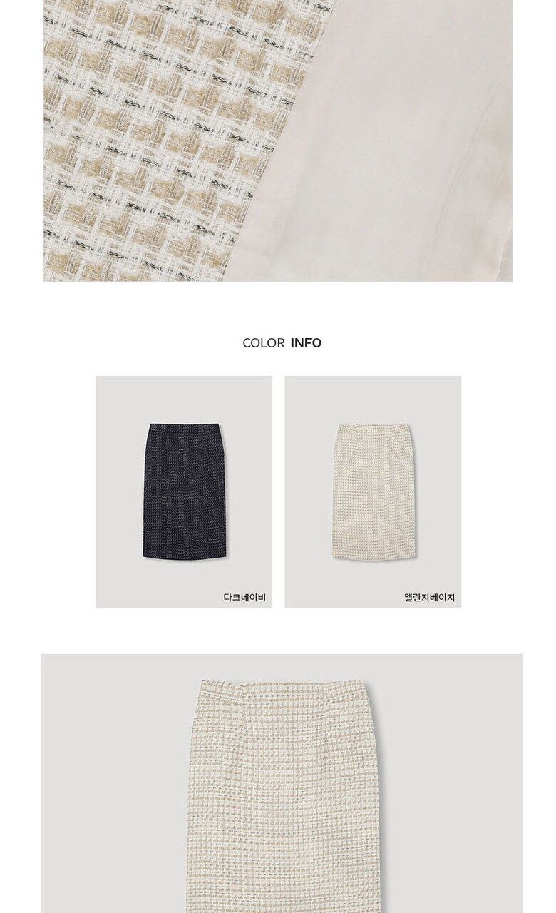 ▶ ITEM : 트위드 미디 스커트 ▶ NUMBER : SWWSKN11040 ▶ FABRIC :겉감:폴리에스터82%,레이온7%,아크릴5%,나일론3%,모2%,면1% 안감:폴리에스터100% 배색:레이온93%,폴리에스터7% (심지,보강재,상표,무늬,레이스,밴드 등 제외) ▶ WASHING : 단독드라이(이염.고온건조 다림질불가) ▶ 원 산 지 : 베트남 ▶ 색 상 : 다크네이비(DN),멜란지베이지(ME)