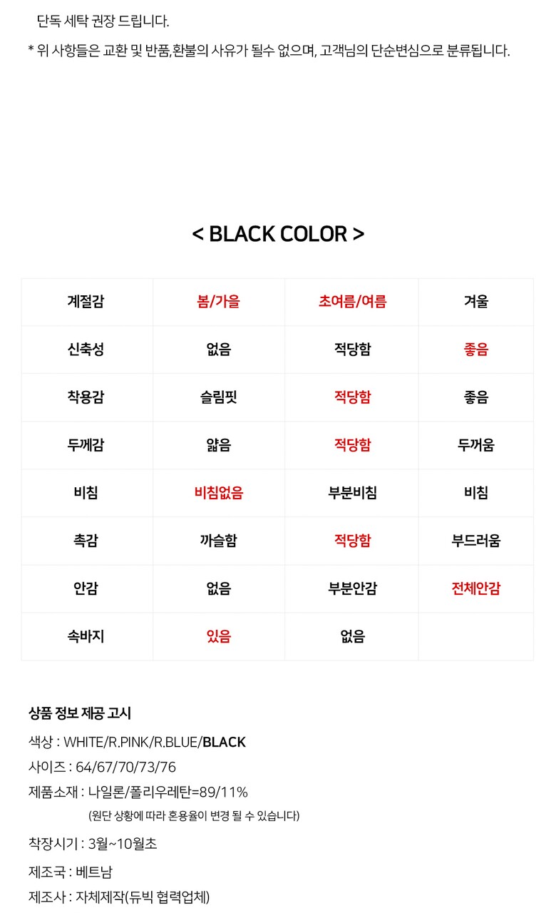 • 처음 배송된 상품상태와 다를 경우(세탁/착용 후 외출하신 경우) 반품이 불가합니다.