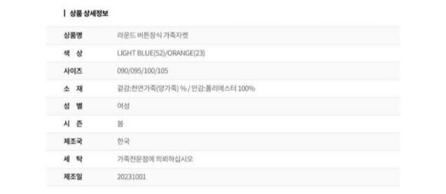 | 1. 제품 소재 (섬유의 조성 또는 혼용률을 백분율로 표시, 기능성인 경우 성적서 또는 허가서) | 상품상세참조 |