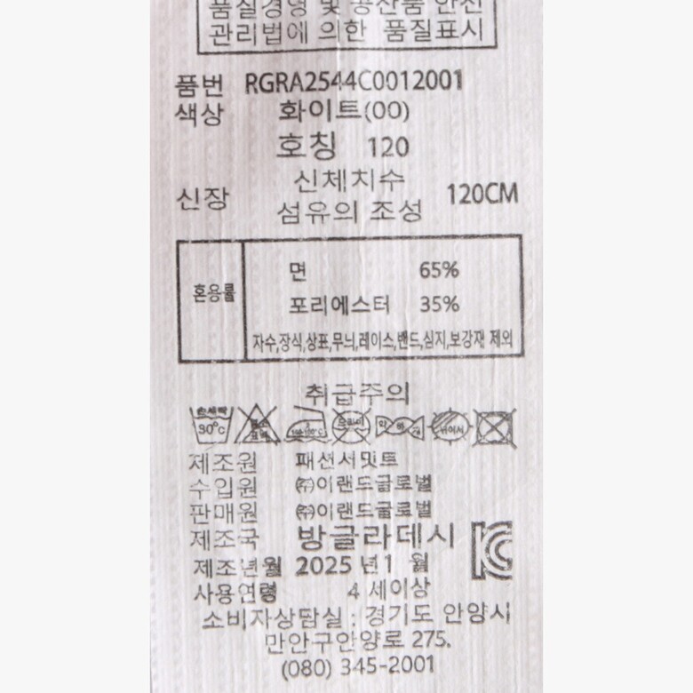 | 1. 제품 소재 (섬유의 조성 또는 혼용률을 백분율로 표시, 기능성인 경우 성적서 또는 허가서) | 상품상세참조 |
