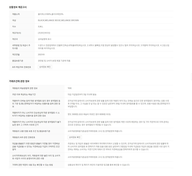 1. 제품 소재 (섬유의 조성 또는 혼용률을 백분율로 표시, 기능성인 경우 성적서 또는 허가서) | 상품상세참조 |