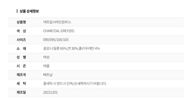 | 1. 제품 소재 (섬유의 조성 또는 혼용률을 백분율로 표시, 기능성인 경우 성적서 또는 허가서) | 상품상세참조 |