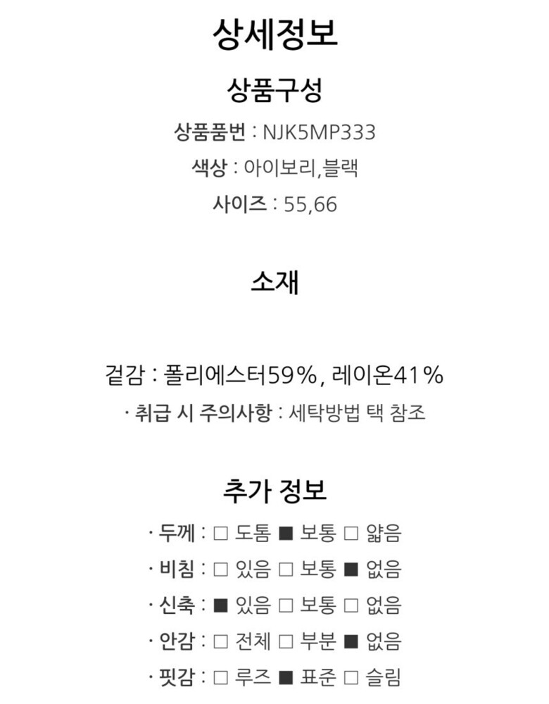 1. 제품 소재 (섬유의 조성 또는 혼용률을 백분율로 표시, 기능성인 경우 성적서 또는 허가서) 상품상세참조