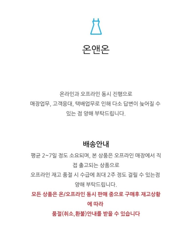 • 처음 배송된 상품상태와 다를 경우(세탁/착용 후 외출하신 경우) 반품이 불가합니다.