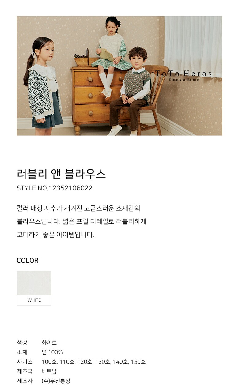 1. 제품 소재 (섬유의 조성 또는 혼용률을 백분율로 표시, 기능성인 경우 성적서 또는 허가서) | 면 100% |
