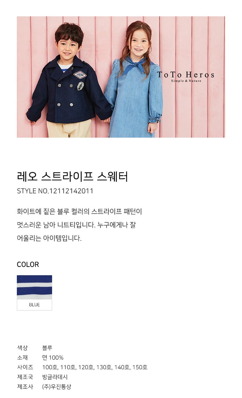 1. 제품 소재 (섬유의 조성 또는 혼용률을 백분율로 표시, 기능성인 경우 성적서 또는 허가서) | 면 100% |