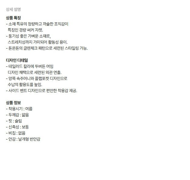 | 1. 제품 소재 (섬유의 조성 또는 혼용률을 백분율로 표시, 기능성인 경우 성적서 또는 허가서) | 상품상세참조 |