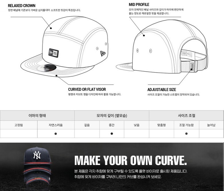 JET CAP은 5개의 패널로 구성된 클래식한 캠프캡입니다. 크라운의 형태는 보통 Relaxed Shape으로 자연스럽고 편안한 피팅감을 주며 모자 내부는 다른 모델과 마찬가지로 Sweat 밴드가 사용되어 탁월한 땀 흡수력과 편안한 착용감을 높였습니다. 모자의 챙은 기본적으로 Flat visor로 제작되며 이는 제품의 이동 시 파손을 방지함과 동시에 개인의 취향에 따라 다양한 각도로 구부려 착용할 수 있도록 하기 위함입니다.