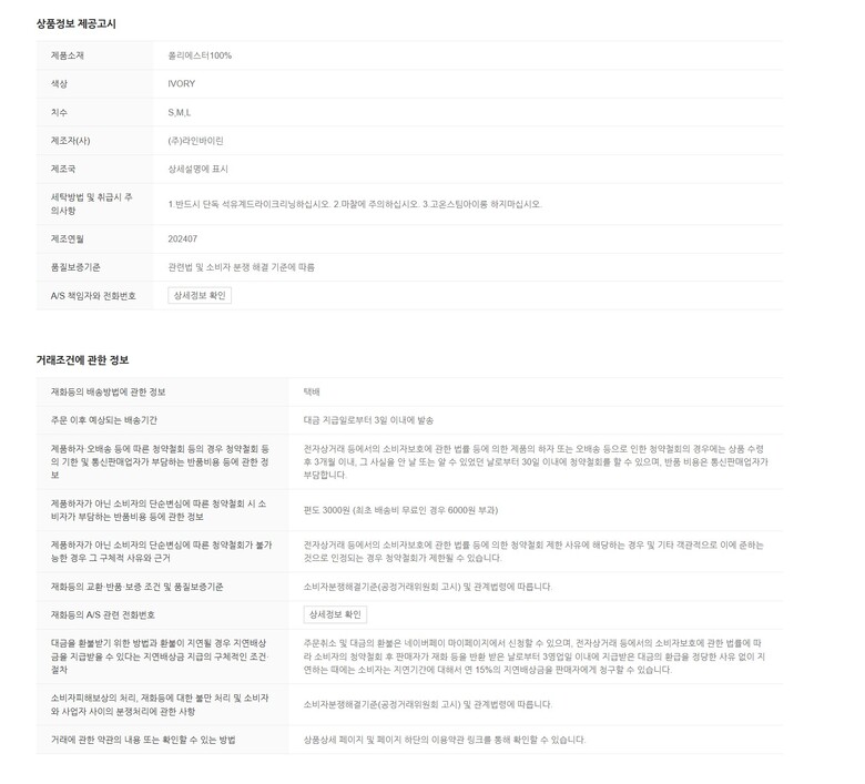 | 6. 세탁방법 및 취급시 주의사항 | 상품상세참조 |