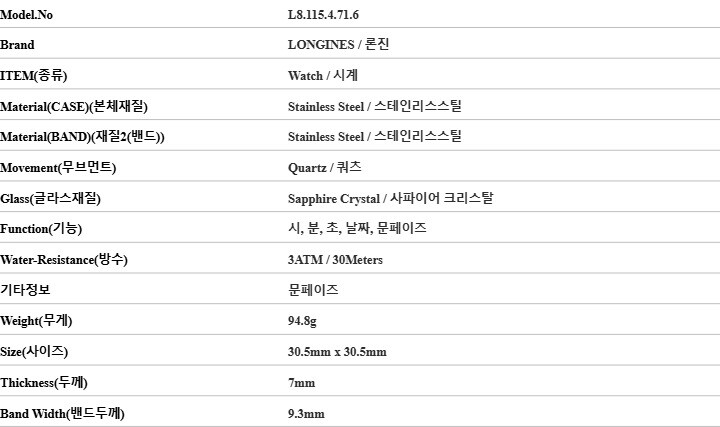 7. 주요 사양 | 스테인리스스틸 시계 쿼츠 |