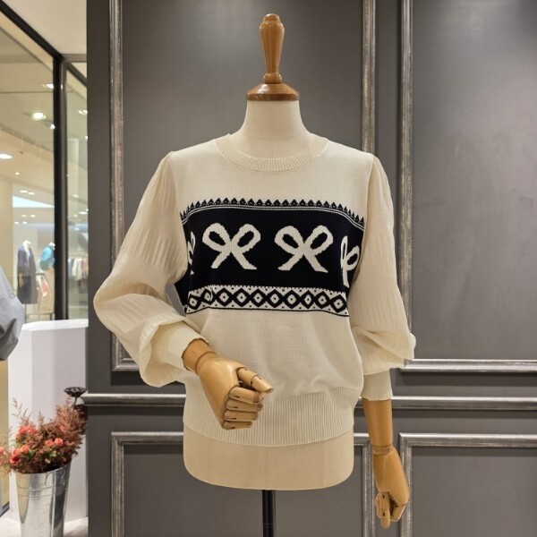 퍼프 소매 디자인의 라운드넥 니트입니다 소매부분은 부드럽게 떨어지는 폴리소재로 배색 되었으며 리본 패턴으로 캐주얼함이 돋보이는 스타일입니다