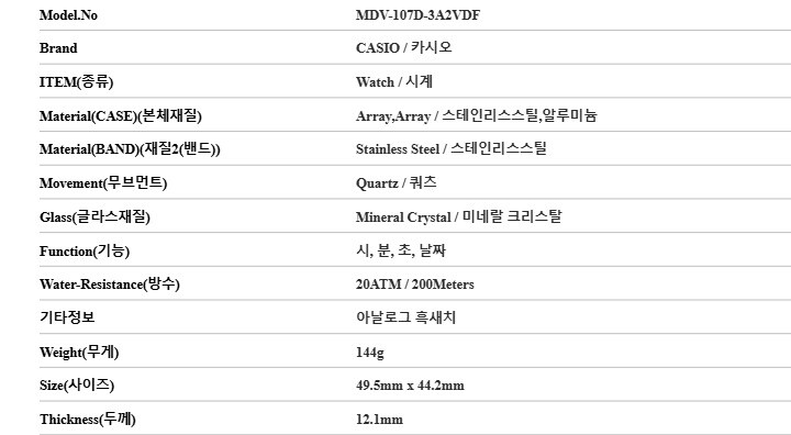 카시오 MDV-107D-3A2VDF (MDV-107D-3A2) 아날로그 흑새치 남성 메탈시계