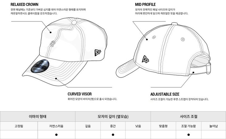 안정적인 깊이감과 형태, 자연스러운 커브드 바이저로 부담 없이 착용 가능합니다. 제품의 안쪽 자체 개발된 Sweat 밴드는 탁월한 땀 흡수력과 착용감을 제공합니다.