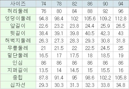 | 3. 치수 | 74(28~29),78(30~31),82(32~33),86(34~35),90(36),94(37~38) |