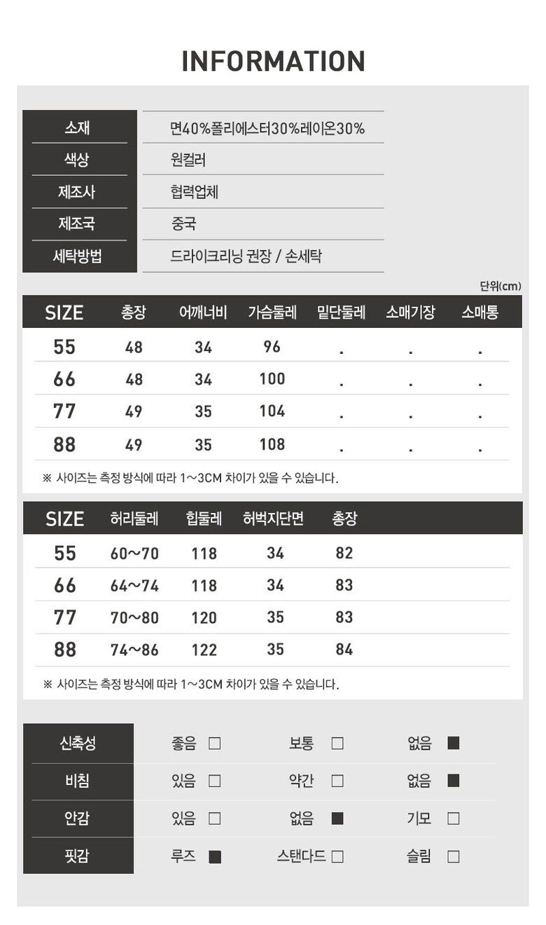 • 처음 배송된 상품상태와 다를 경우(세탁/착용 후 외출하신 경우) 반품이 불가합니다.
