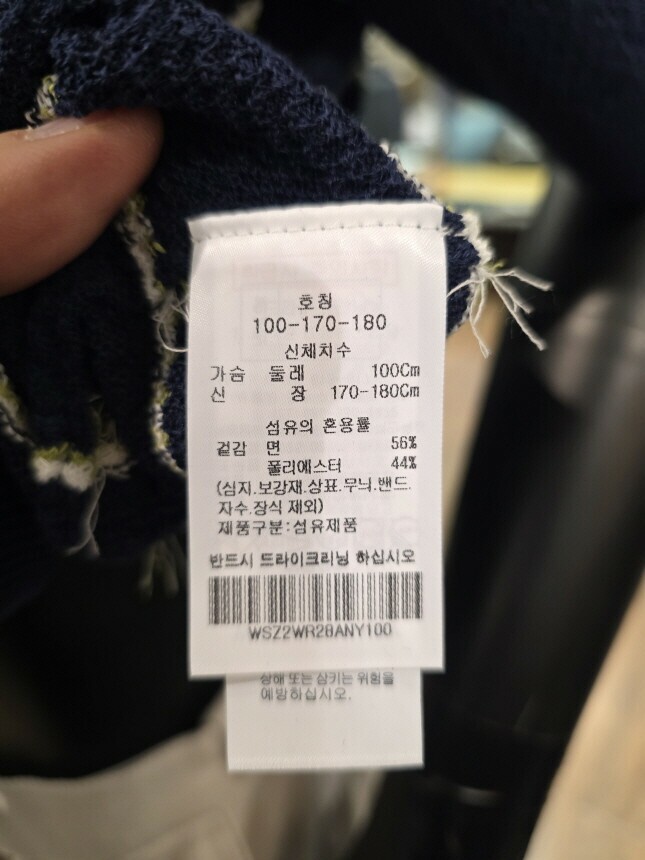 | 1. 제품 소재 (섬유의 조성 또는 혼용률을 백분율로 표시, 기능성인 경우 성적서 또는 허가서) | 겉감 : 면 56% , 폴리에스터 44% (심지,보강재,상표,무늬,밴드,자수, |