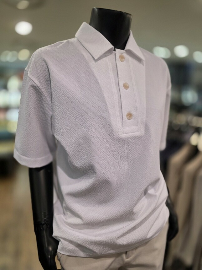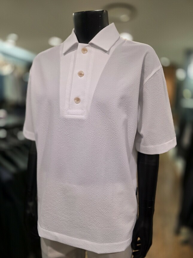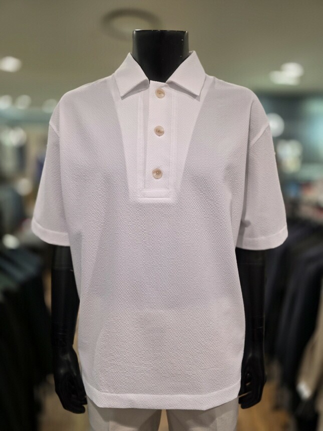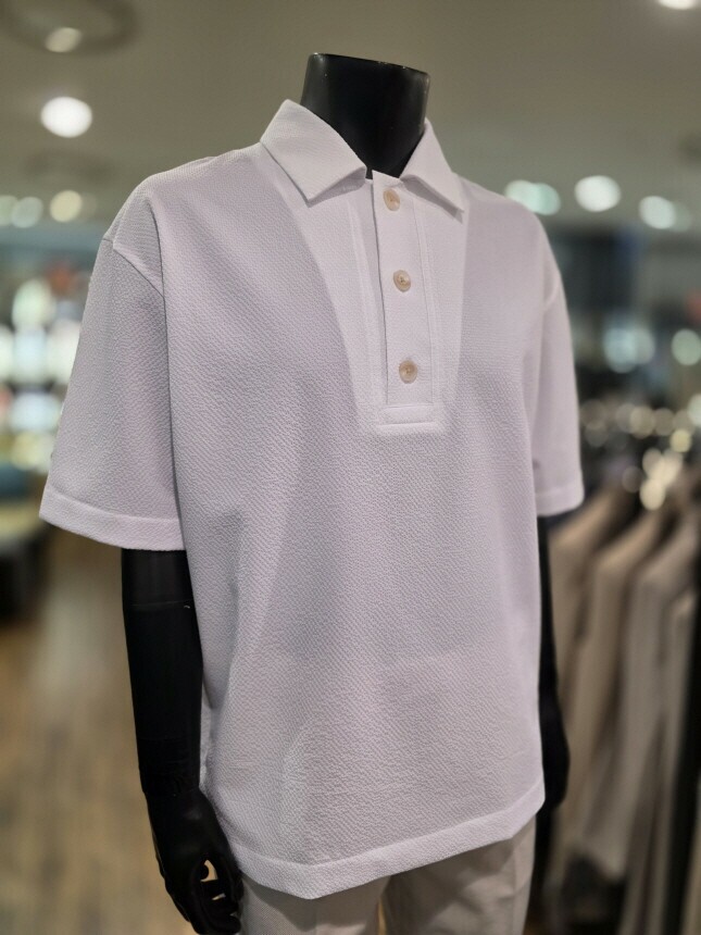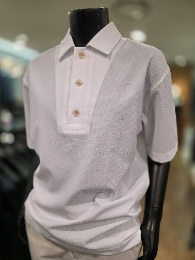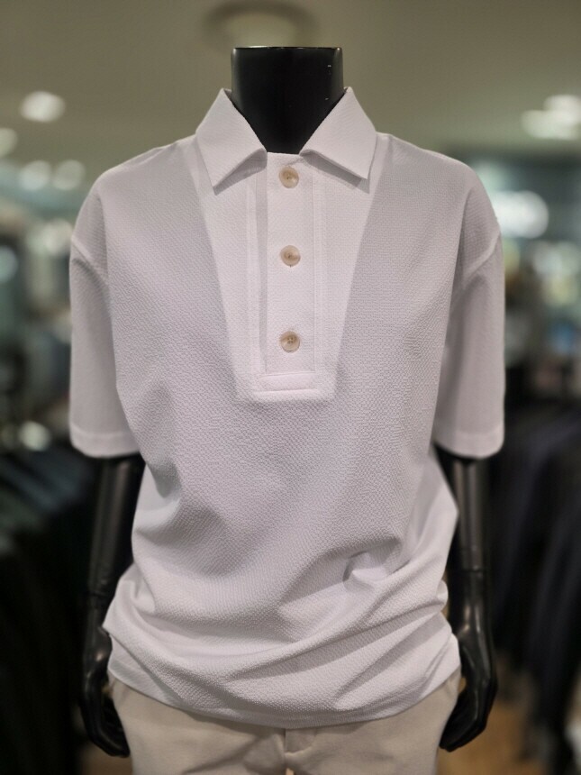 [바쏘옴므] Z2KT91A 25년S/S 화이트 3버튼 시어서커 오버핏 반소매 피케 티셔츠