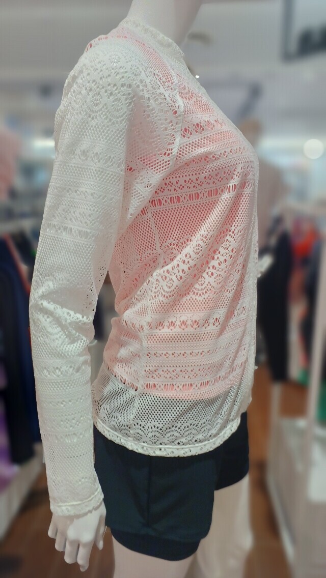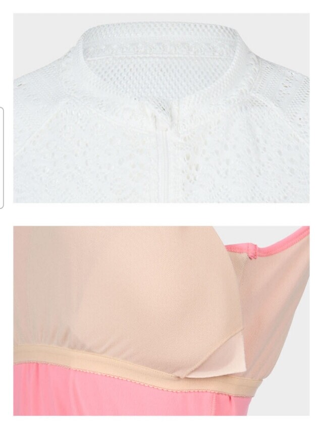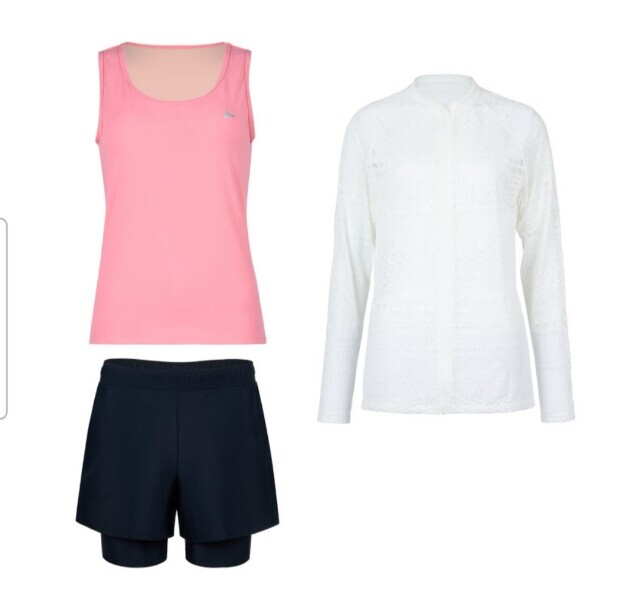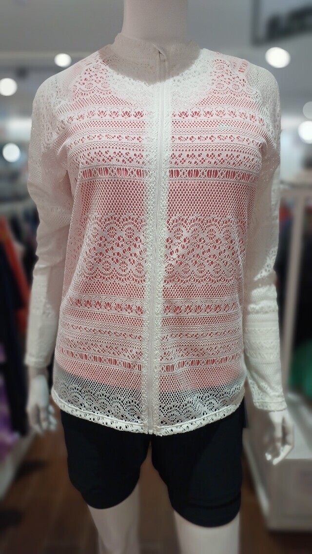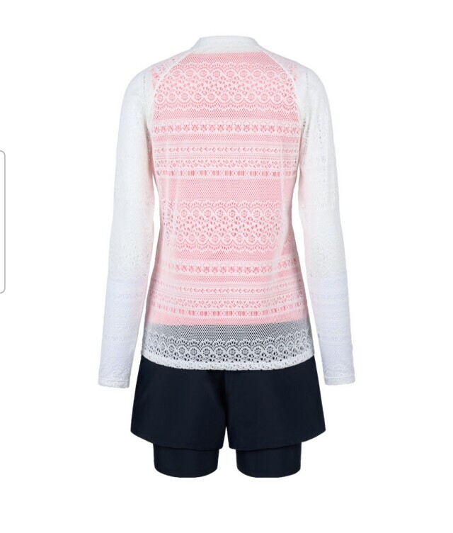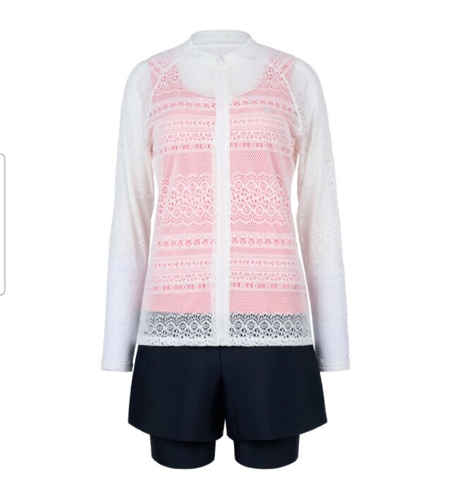 어깨를 감싸주는 탱크 탑과 레깅스 부착 팬츠로 착용하기 편한 크로셰 3피스 집업 래쉬가드 세트입니다 .