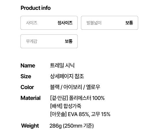 1. 제품 소재 (운동화인 경우에는 겉감, 안감을 구분하여 표시) 배색:폴리에스테르, 고무