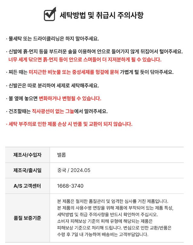 • 처음 배송된 상품상태와 다를 경우(세탁/착용 후 외출하신 경우) 반품이 불가합니다.