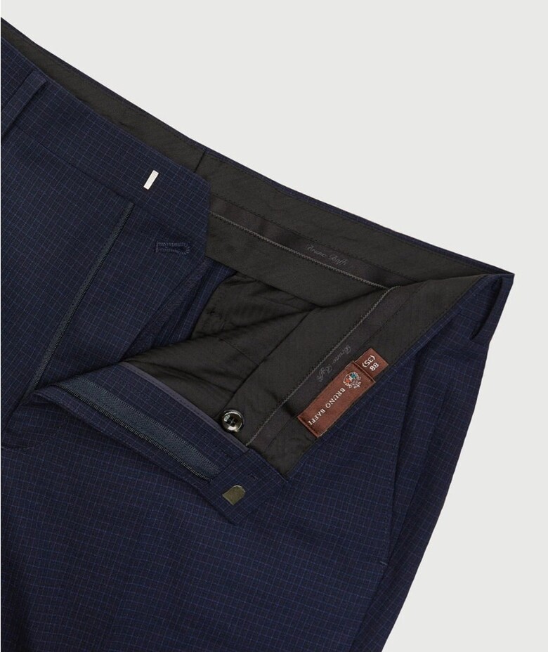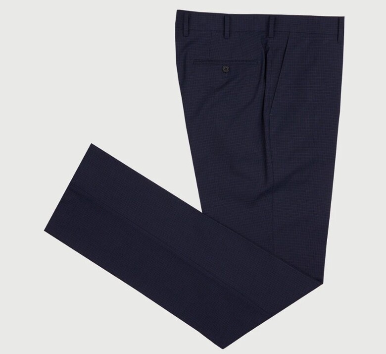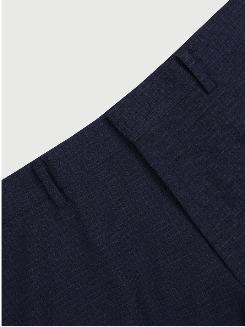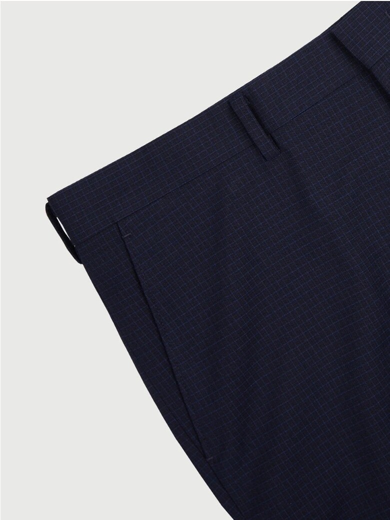 베이직한 스타일의 잔체크 네이비 정장팬츠입니다.