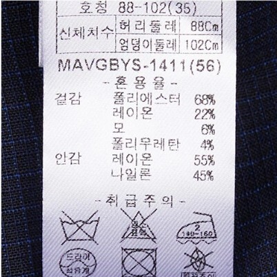 겉감 : 폴리에스터 68% 레이온 22% 모 6% 폴리우레탄 4% 안감 : 레이온 55% 나일론 45%