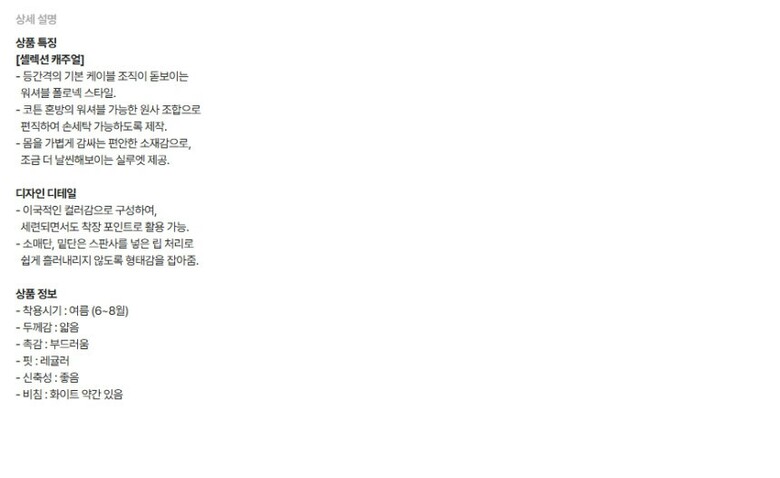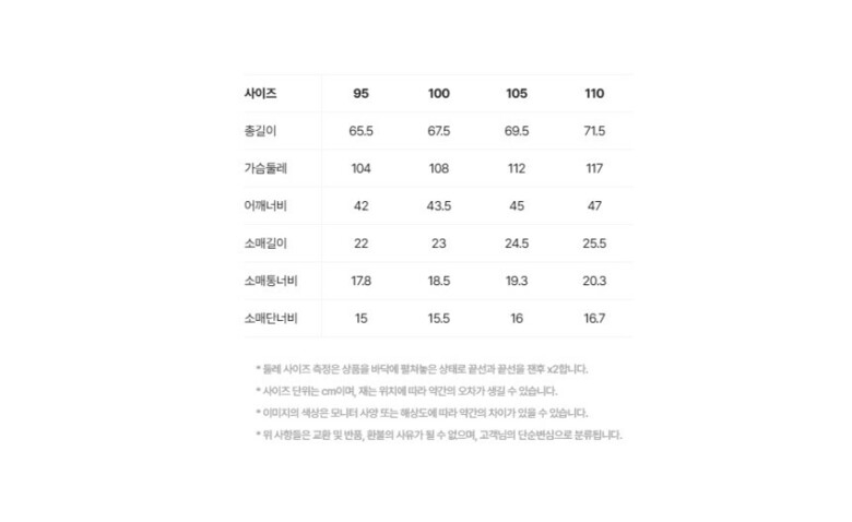| 1. 제품 소재 (섬유의 조성 또는 혼용률을 백분율로 표시, 기능성인 경우 성적서 또는 허가서) | 상품상세참조 |