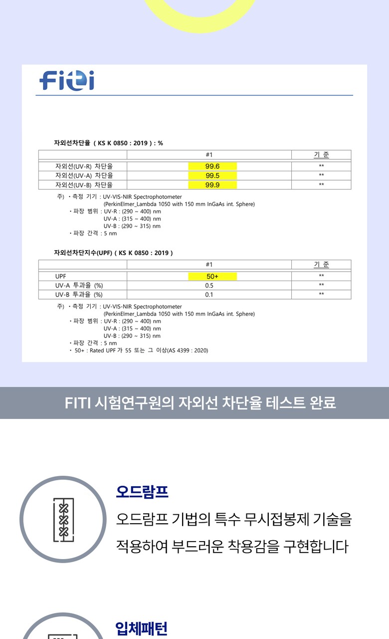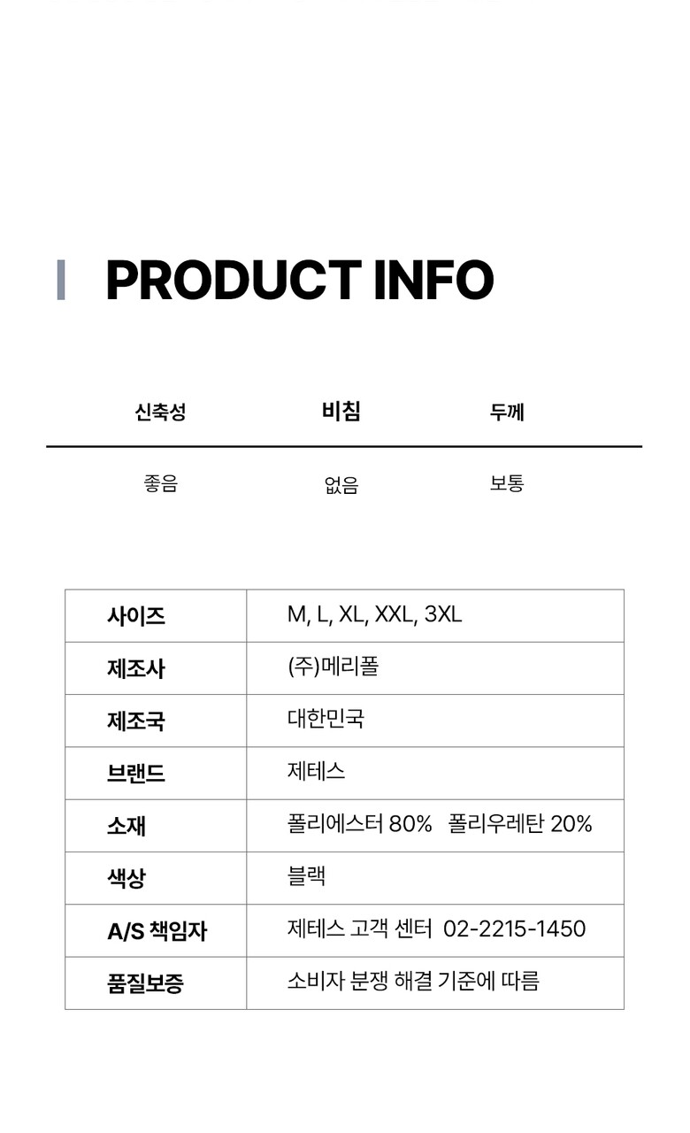 1. 제품 소재 (섬유의 조성 또는 혼용률을 백분율로 표시, 기능성인 경우 성적서 또는 허가서) | 폴리에스터 80% , 폴리우레탄 20% |