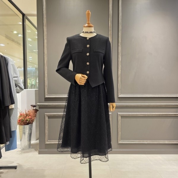 레이어드한 느낌의 이중 원피스로 스팽글 스커트가 포인트인 디자인입니다