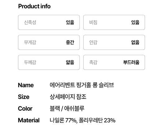 | 1. 제품 소재 (섬유의 조성 또는 혼용률을 백분율로 표시, 기능성인 경우 성적서 또는 허가서) | 상품상세참조 |
