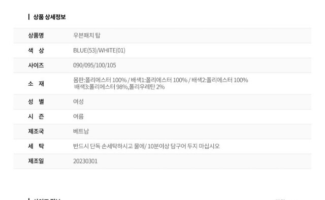 | 1. 제품 소재 (섬유의 조성 또는 혼용률을 백분율로 표시, 기능성인 경우 성적서 또는 허가서) | 상품상세참조 |