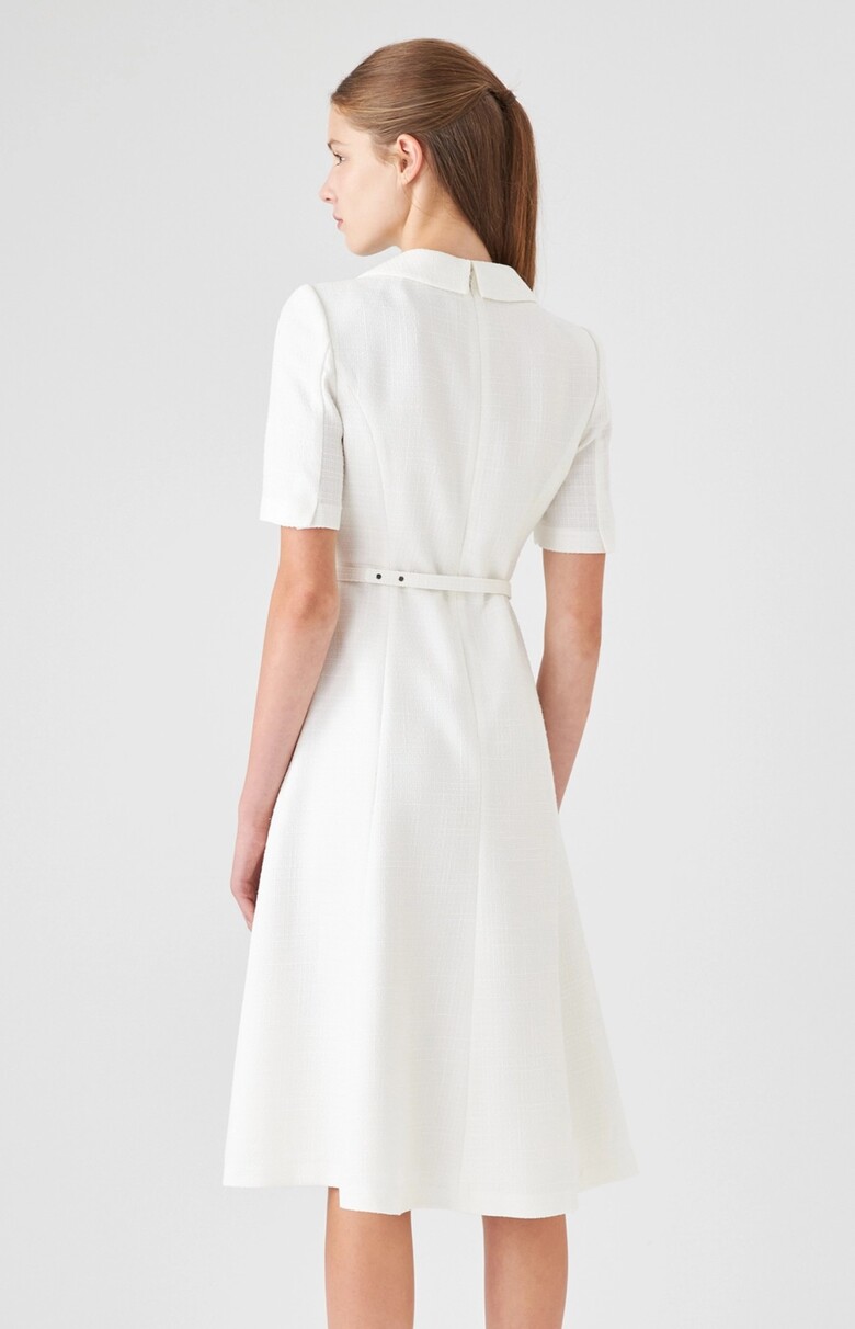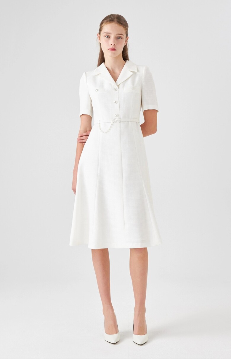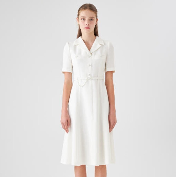 카라 디자인이 돋보이는 미디 기장 원피스입니다.