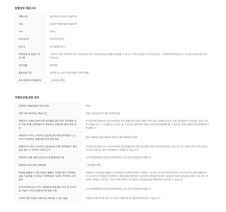 | 6. 세탁방법 및 취급시 주의사항 | 상품상세참조 |