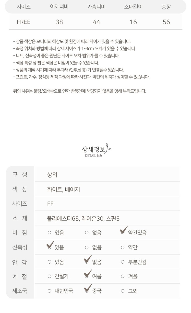 1. 제품 소재 (섬유의 조성 또는 혼용률을 백분율로 표시, 기능성인 경우 성적서 또는 허가서) | 상세페이지 참조 |