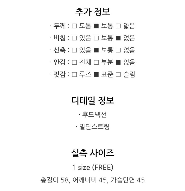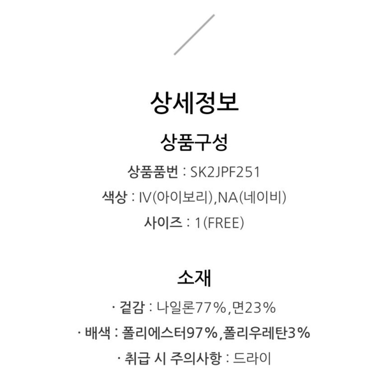 | 1. 제품 소재 (섬유의 조성 또는 혼용률을 백분율로 표시, 기능성인 경우 성적서 또는 허가서) | 상품상세참조 |