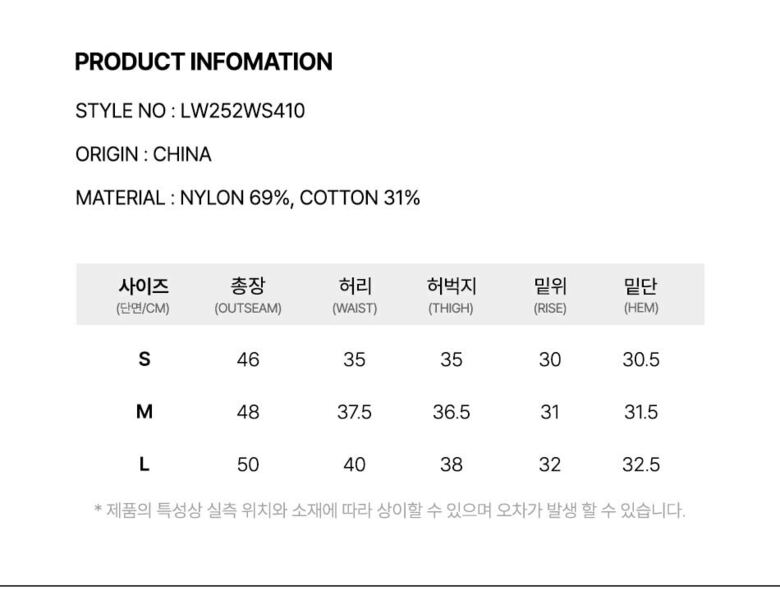 | 1. 제품 소재 (섬유의 조성 또는 혼용률을 백분율로 표시, 기능성인 경우 성적서 또는 허가서) | 겉감:나일론 69%, 면 31% |