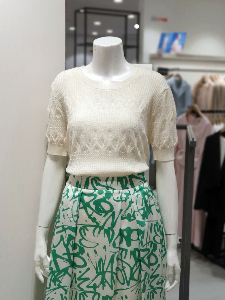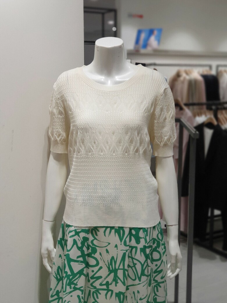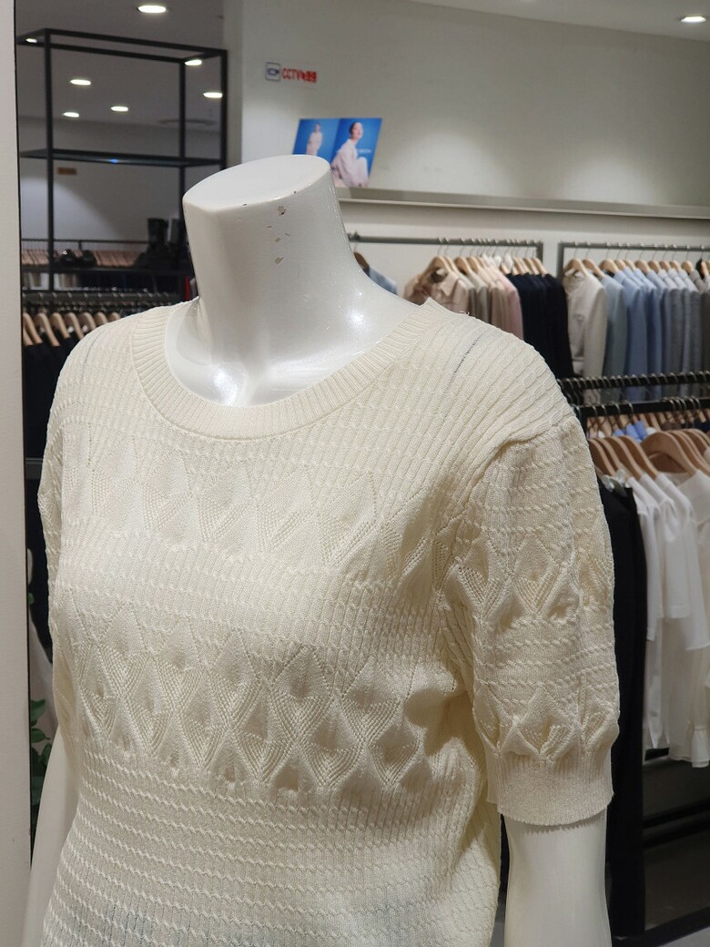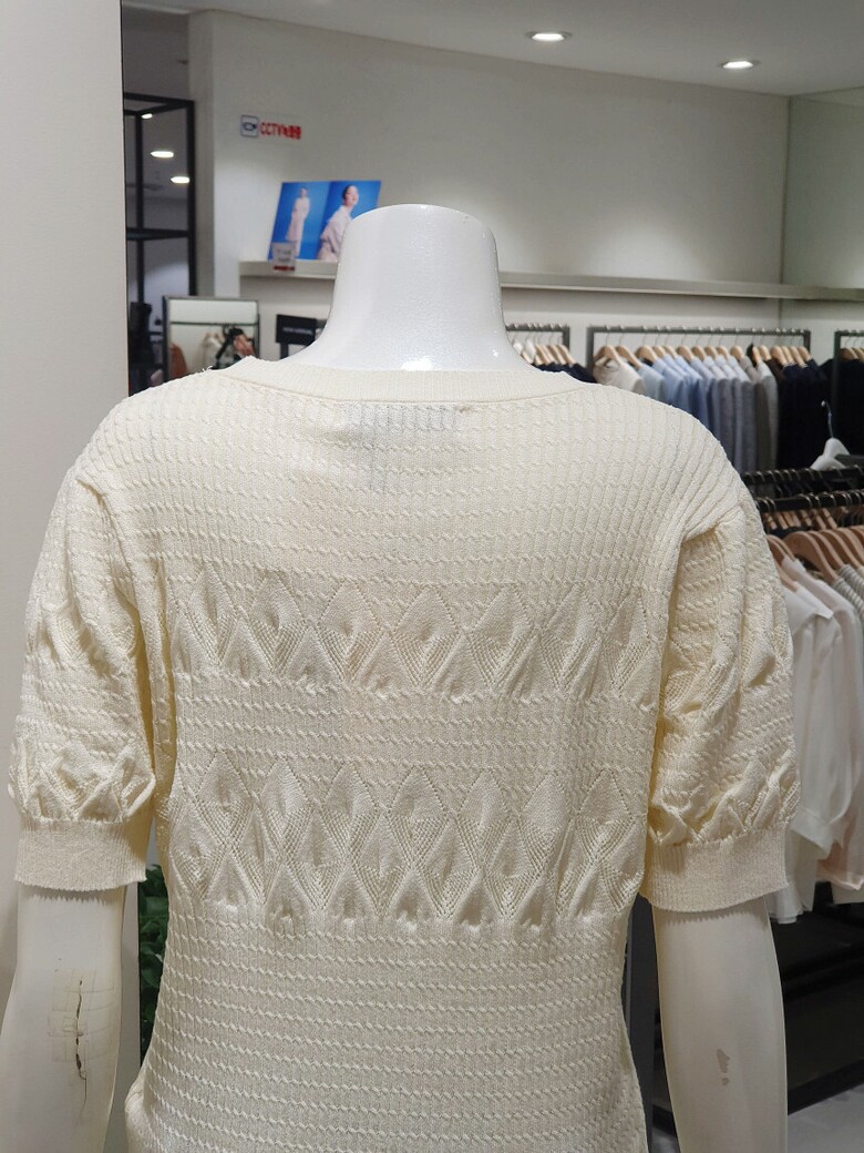 라운드 넥 라인에 짜임 배색 디테일로 포인트를 주며