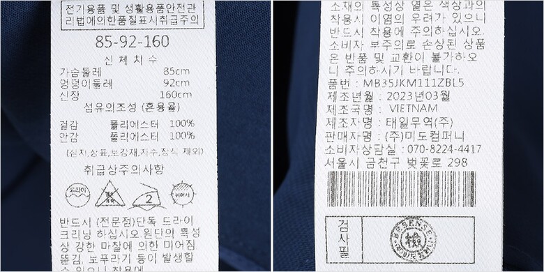 | 1. 제품 소재 (섬유의 조성 또는 혼용률을 백분율로 표시, 기능성인 경우 성적서 또는 허가서) | 겉감-폴리에스터100% 안감-폴리에스터100% |