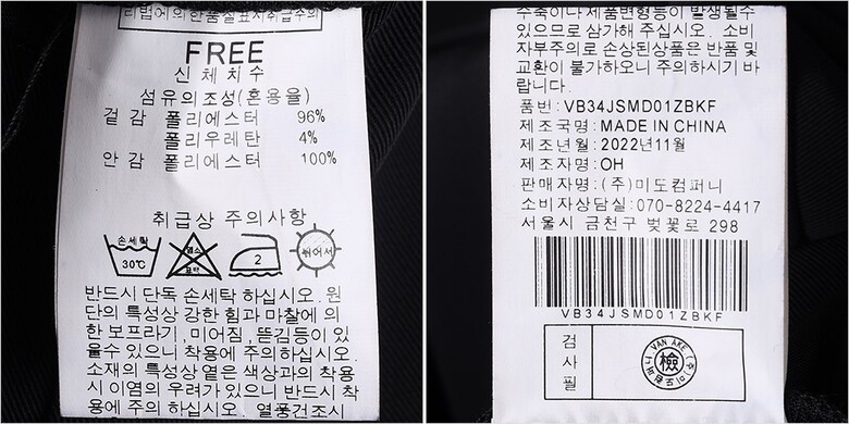 | 1. 제품 소재 (섬유의 조성 또는 혼용률을 백분율로 표시, 기능성인 경우 성적서 또는 허가서) | 겉감-폴리에스터96% 폴리우레탄4% 안감-폴리에스터100% |