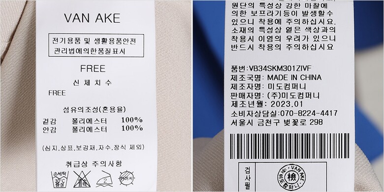 | 1. 제품 소재 (섬유의 조성 또는 혼용률을 백분율로 표시, 기능성인 경우 성적서 또는 허가서) | 겉감-폴리에스터100% 안감-폴리에스터100% |